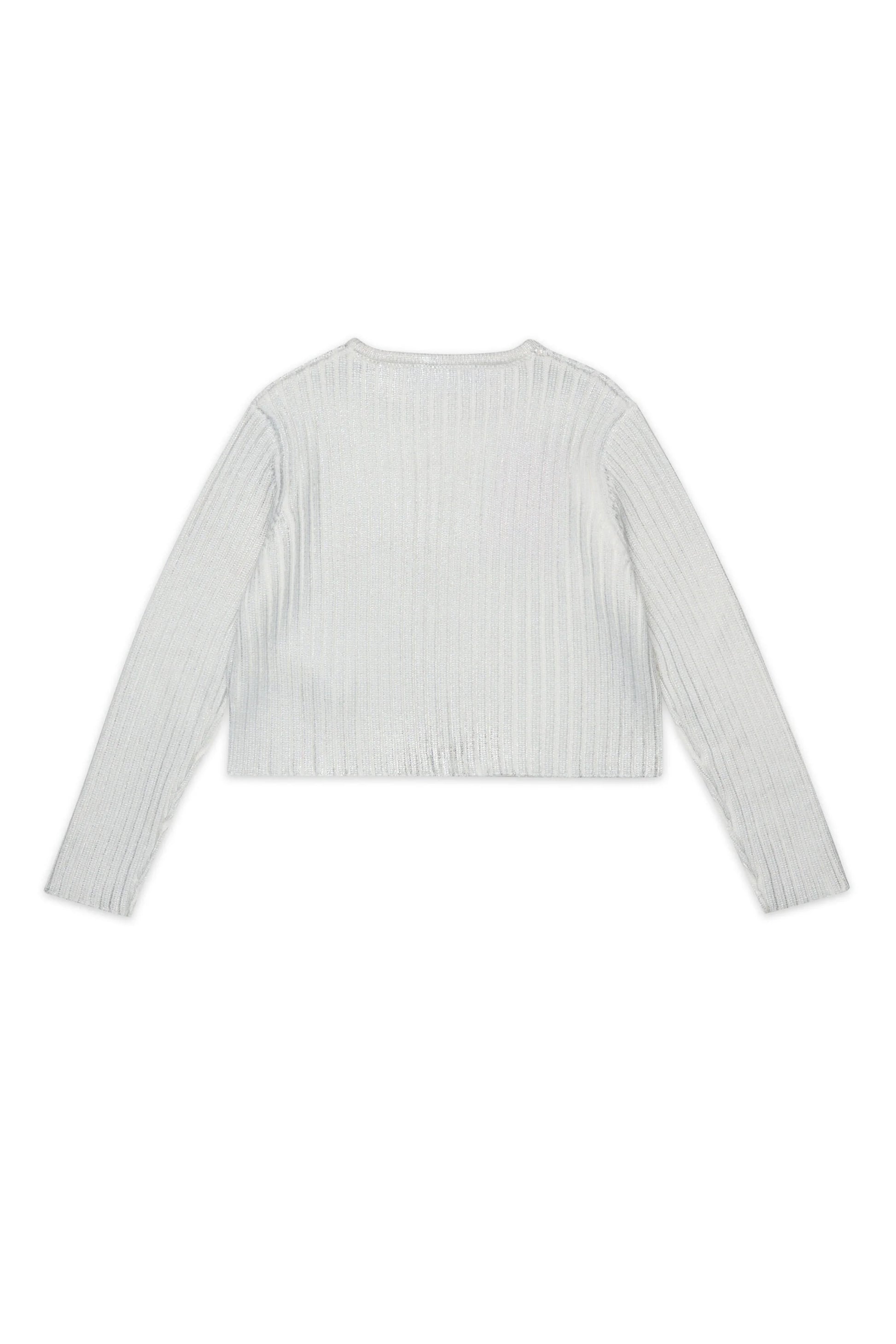 Pullover boxy manica lunga in maglia misto lana a coste. Morbido e caldo è impreziosito da una finitura mylar che dona al capo un aspetto luminoso.