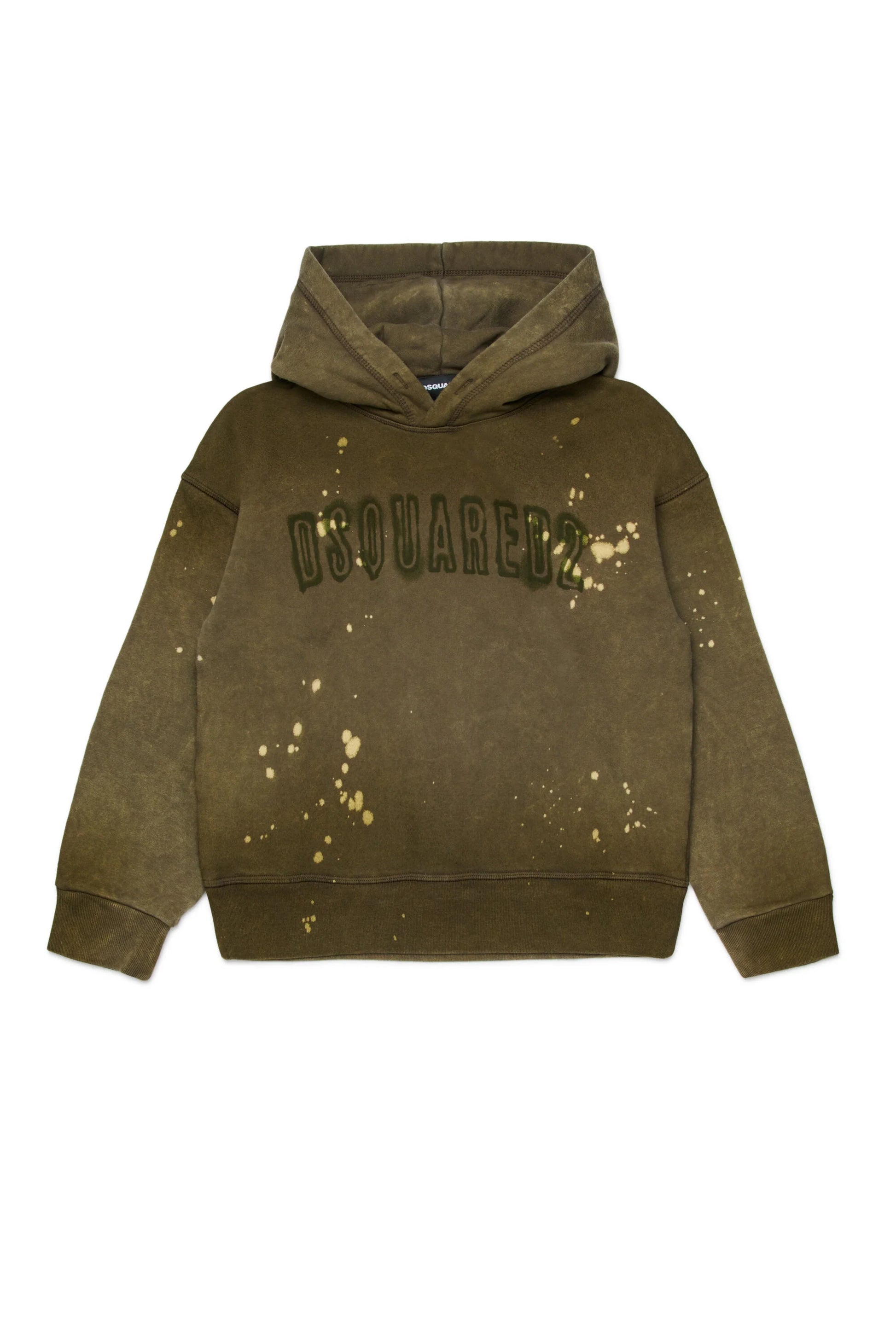 Felpa con cappuccio effetto vintage a manica lunga. Le macchie di colore irregolari e il logo Dsquared2 volutamente rovinato esprimono un’estetica urbana.